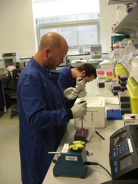 In order to follow genes and to examine their possible contributions to human behaviours such as musical ability or extroversion, we first have to find groups of suitable individuals and persuade them to allow us to sample their DNA. In the past, DNA was usually extracted from blood but some individuals are not keen to have blood taken for this purpose. More recently, however, our laboratory has developed a more “user-friendly” approach - used in this study - in which a few cotton buds are used to wipe the inside of the cheeks to collect cellular material. The swabs are then placed in a stabilising liquid that enables the sample to be safely transported by post or by other means to the laboratory. On arrival, the liquid is separated from the buds, heated to activate the protein degrading agent present and the DNA subsequently extracted (figure 1) and purified by precipitation using alcohol. The DNA is then stored at -80 degrees (figure 2).